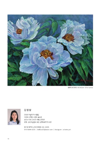 모란이 피기까지 40.9x53cm Oil on canvas 김 영 랑 한양대 미술학 학사 졸업 자연의 산책전, 내면의 울림전 숨쉬는 바람 소리전, 여행스케치전 현재 : 송탄미술협회 회원, 평택회화작가 회원 경기도 평택시 고덕국제대로 232. 202동 010-5644-3223 ㅣ kidillust22@naver.com ㅣ Instagram : ce1erina_art 14