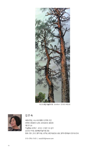 여기가 호암 미술관이래 135x68cm 한지에 수묵담채 김 은 숙 세종대학원, 수도사대 회화과 한국화 전공 부부전 3회(맑은시선전, 푸른갈등전, 필연전) 개인전 5회 작품활동 40여년 – 초대전, 단체전 다수 참여 잠실입시학원, 송탄예원미술학원 경영 현재 : 한국, 경기, 평택미협, 성묵회, 송탄미술인회 회원, 평택시민예술대 한국화 강사 010-2764-7401 ㅣ sorjt010@naver.com 16