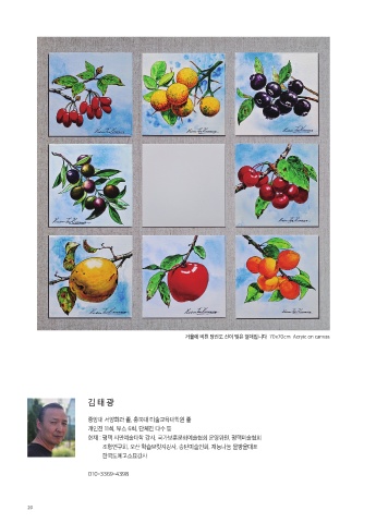 거울에 비친 당신도 신이 빚은 열매입니다 70x70cm Acryic on canvas 김 태 광 중앙대 서양화과 졸, 충북대 미술교육대학원 졸 개인전 11회, 부스 6회, 단체전 다수 등 현재 : 평택 시민예술대학 강사, 국가보훈문화예술협회 운영위원, 평택미술협회 조형연구회, 오산 학습브릿지강사, 송탄미술인회, 재능나눔 물방울대표 한국도예고소묘강사 010-3369-4398 20