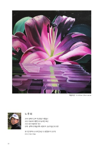 백합의 꿈 116.7x91cm Oil on canvas 노 주 희 2019 평택시 남부 여성회관 마중물전 2021 제40회 대한민국미술대전 특선 2023 경기미술대전 입선 현재 : 평택시민예술대학 서양화부, 송탄미술인회 회원 경기도 평택시 상서재로4길 13 센트럴자이 207동 010-7146-7144 22