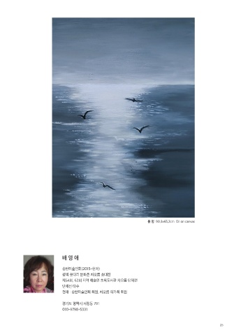 물 멍 90.3x65.2cm Oil on canvas 배 영 애 송탄미술인회(2015~현재) 평택 웃다리 문화촌 차오름 초대전 제54회, 62회 지역 예술인 초록도서관 차오름 단체전 단체전 다수 현재 : 송탄미술인회 회원, 차오름 작가회 회원 경기도 평택시 서정동 791 010-9798-5331 25