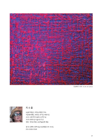길 찾다가 10호 Acrylic on canvas 지 소 을 모듬회 회원전, 아다모 회원전 다수 지중해 싸롱전, 파리전, 호주전, 하와이전 2025 국제 작은미술제 신진작가상 2025 현대여성 미술대전 특선 현재 : 아다모 회장, 송탄미술인회 회원 경기도 평택시 죽백 8길 효성헤링턴코트 102동 010-3938-0308 49