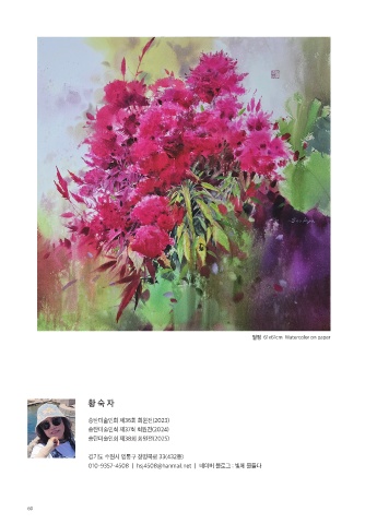 열정 61x61cm Watercolor on paper 황 숙 자 송탄미술인회 제36회 회원전(2023) 송탄미술인회 제37회 회원전(2024) 송탄미술인회 제38회 회원전(2025) 경기도 수원시 영통구 청명북로 33(432동) 010-9357-4508 ㅣ hsj4508@hanmail.net ㅣ 네이버 블로그 : 빛에 물들다 60