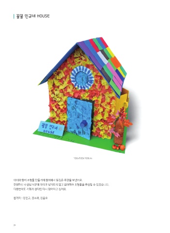 꿀꿀 민규네 HOUSE 100x100x108cm 아이와 함께 조형물 만들기에 참여해서 뜻깊은 주말을 보냈어요. 친절하신 선생님 덕분에 아이가 낯가리지 않고 참여하여 조형물을 완성할 수 있었습니다. 다음번에도 기회가 된다면 다시 참여하고 싶어요. 참가자 : 장민규, 장소라, 장윤호 24