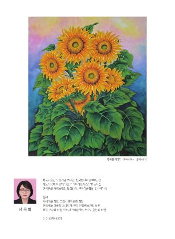 행복한 이야기 60.6x50cm 순지+채색 한국미술관 오픈기념 초대전, 한국현대미술100인전 하노이국제 아트페어전, 코리아아트페스티발 뉴욕전 한국문화 총예술협회 협회장상, 한국미술협회 우수작가상 현재 채색마을 회장, 그림사랑휘원회 회장 한국새늘 미술회 초대작가, 한국 전업미술가회 회원 남 옥 희 한국 구상회 회원, 인천서구예술인회, 서구미술협회 회원 010-6379-8673