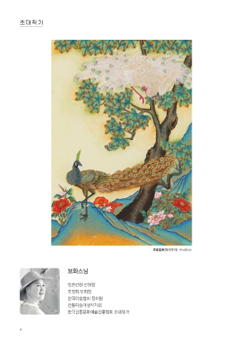 초 대 작 가 초 대 작 가 華蓋富貴(화개부귀) 99x68cm 보화스님 영천선원 선원장 호정회 부회장 한국미술협회 정회원 전통미술여성작가회 한국전통문화예술진흥협회 초대작가 4