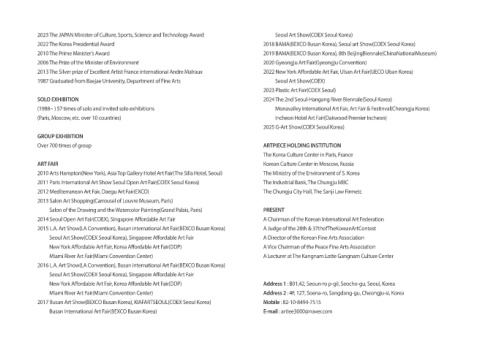 2013 The Silver prize of Excellent Artist France international Andre Malraux     2022 New York Affordable Art Fair, Ulsan Art Fair(UECO Ulsan Korea)
