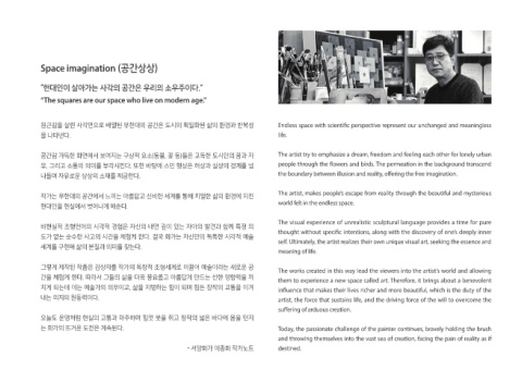 공간감 가득한 화면에서 보여지는 구상적 요소(동물, 꽃 등)들은 고독한 도시인의 꿈과 자 The artist try to emphasize a dream, freedom and feeling each other for lonely urban