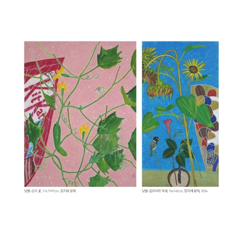 낮별-오이 꽃, 116.7×91cm, 장지에 분채 낮별-검은머리 딱새, 76x145cm, 장지에 분채, 2024