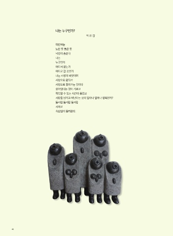 나는 누구인가? 박 찬 갑 파란하늘 노란 듯 붉은 듯 낙엽이 춤춘다 나는 누구인가 어디서 왔는가 어디로 갈 것인가 나는 사랑의 씨앗이며 사랑으로 왔다가 사랑으로 돌아가는 것이다 살아있다는 것이 기쁘고 작업할 수 있는 시간이 즐겁고 사랑을 남기고 떠난다는 것이 얼마나 얼마나 행복한가? 돌사람 돌사람 돌사람 사이로 속삼임이 들려온다. 48
