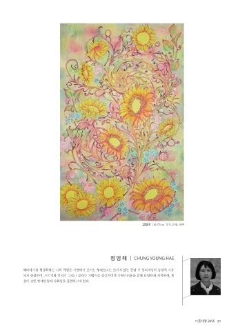 교향곡 116x73cm 장지, 분채, 채색 정 영 해 ㅣ CHUNG YOUNG HAE 해바라기를 형상화하는 나의 작업은 자연에서 보이는 형태보다는 보이지 않는 관념 즉 상외지상의 동양적 사유 에서 출발하며, 스미기와 번지기 그리고 꼴라주 기법으로 상상적이며 자연스러움을 위해 다양하게 채색하여, 개 성이 강한 현대인들의 자화상을 표현하고자 한다. 미동재정 2025 29