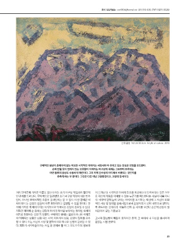 인지, 아니면 무의식적인 흐름의 결과인지는 알 수 없다. 다만 절제된 색 다. 바꾸어 말해 눈에 보이는 이미지를 포기하 는 대신에 그 자신의 회화
