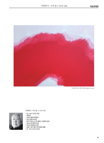서양화가 | 이우섭 U SUB-LEE 지상초대전 TRACE241024, 400×400, Acrylic on canvas 서양화가 | 이우섭 U SUB-LEE •전 : subi 디자인 대표 •개인전 •2022 갤러리라메르 •2021 갤러리이즈 •2017 이천 산수유 축제 사생대회 참여 •2018 경기미전 입선 •2018 인천미전 입선 •현재 : 경기 광주 미사랑회 회원 •M : 010-5240-6093 45 45