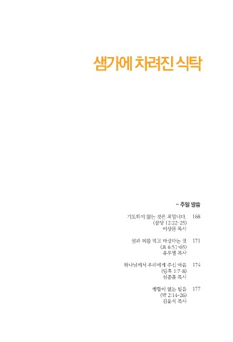 샘가에 차려진 식탁 - 주일 말씀 기도하지 않는 것은 죄입니다. 168 (삼상 12:22-25) 이상문 목사 살과 피를 먹고 마신다는 것 171 (요 6:51-65) 유우열 목사 하나님께서 우리에게 주신 마음 174 (딤후 1:7-8) 심종훈 목사 행함이 없는 믿음 177 (약 2:14-26) 김윤석 목사
