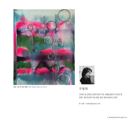파생 _ 끝나지 않은 굴레 25호 Mixed media on canvas 구 영 미 단체전 및 군풍전, 용인여성작가회, 퍼플썬갤러리 초대전 등 현재 : 용인여성작가회 회원, 용인 용마초등학교 재직 E-mail : miluho@naver.com 9 _ 제9회 용인여성작가회 정기전 (예술 & 가치)
