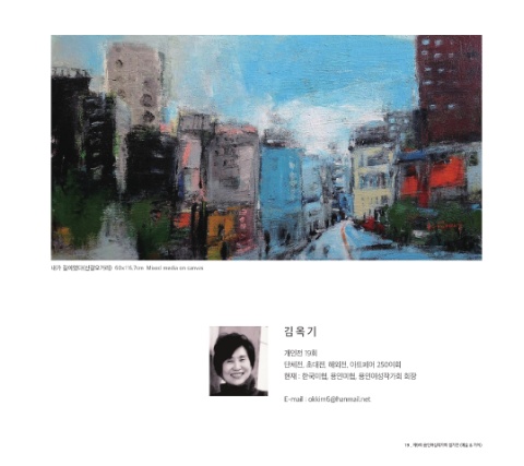 내가 길이었다(신갈오거리) 60x116.7cm Mixed media on canvas 김 옥 기 개인전 19회 단체전, 초대전, 해외전, 아트페어 250여회 현재 : 한국미협, 용인미협, 용인여성작가회 회장 E-mail : okkim6@hanmail.net 19 _ 제9회 용인여성작가회 정기전 (예술 & 가치)