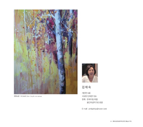 김 재 숙 개인전 6회 자작나무 116.8x80.3cm Acrylic on canvas 국내외 단체전 다수 현재 : 한국미협 회원 용인여성작가회 회원 E-mail : pinkpinkjs@naver.com 21 _ 제9회 용인여성작가회 정기전 (예술 & 가치)
