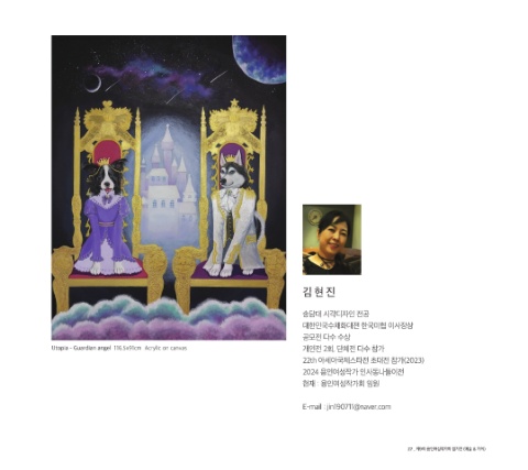 김 현 진 송담대 시각디자인 전공 대한민국수채화대전 한국미협 이사장상 공모전 다수 수상 Utopia - Guardian angel 116.5x91cm Acrylic on canvas 개인전 2회, 단체전 다수 참가 22th 아세아국제스타전 초대전 참가(2023) 2024 용인여성작가 인사동나들이전 현재 : 용인여성작가회 임원 E-mail : jin190711@naver.com 27 _ 제9회 용인여성작가회 정기전 (예술 & 가치)