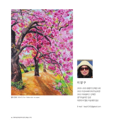 이 양 구 2020~2025 물향기 단체전 6회 2022 아산HB페이퍼(주)순회전 2022 아트플레그 단체전 봄의 정서 100x72.7cm Watercolor on paper 경기미술대전 입상 대한민국 힐링 미술대전 입상 E-mail : leeyk1242@gmail.com 60 _ 제9회 용인여성작가회 정기전 (예술 & 가치)