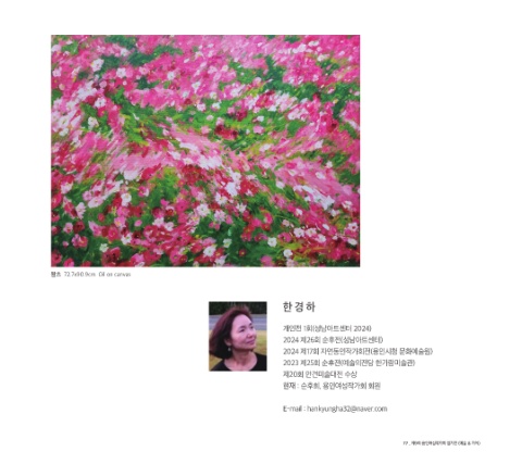 왈츠 72.7x90.9cm Oil on canvas 한 경 하 개인전 1회(성남아트센터 2024) 2024 제26회 순후전(성남아트센터) 2024 제17회 자연동인작가회전(용인시청 문화예술원) 2023 제25회 순후전(예술의전당 한가람미술관) 제20회 안견미술대전 수상 현재 : 순후회, 용인여성작가회 회원 E-mail : hankyungha32@naver.com 77 _ 제9회 용인여성작가회 정기전 (예술 & 가치)