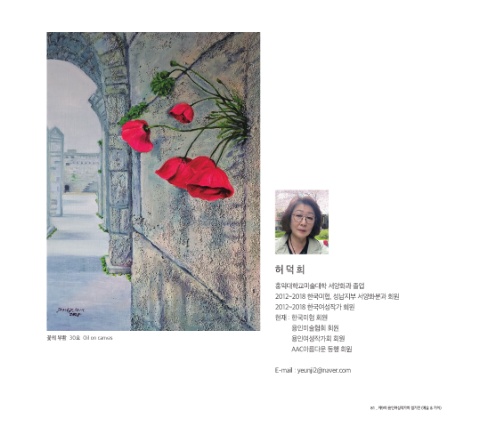 허 덕 희 홍익대학교미술대학 서양화과 졸업 2012~2018 한국미협, 성남지부 서양화분과 회원 2012~2018 한국여성작가 회원 현재 : 한국미협 회원 용인미술협회 회원 꽃의 부활 30호 Oil on canvas 용인여성작가회 회원 AAC아름다운 동행 회원 E-mail : yeunji2@naver.com 81 _ 제9회 용인여성작가회 정기전 (예술 & 가치)