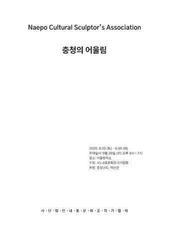 Naepo Cultural Sculptor’s Association 충청의 어울림 2025. 9.20 (토) - 9.30 (화) 초대일시: 9월 20일 (토) 오후 5시 - 7시 장소: 이음창작소 주최: 사) 내포문화조각가협회 후원: 충청남도, 예산군 사 ・단 ・법 ・인 ・내 ・포 ・문 ・화 ・조 ・각 ・가 ・협 ・회