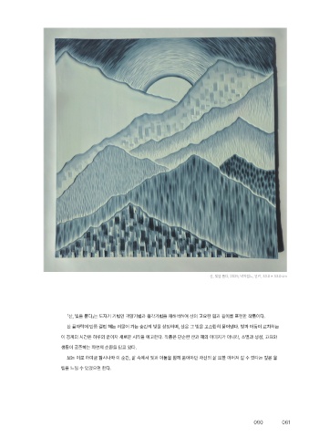「산, 빛을 품다」는 도자기 기법인 귀얄기법과 음각기법을 재해석하여 산의 고요한 힘과 깊이를 표현한 작품이다.