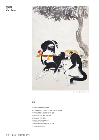 김세미 Kim Semi 엄마, 2020, 종이에 수간분채, 20호 경력 동국대학교 예술대학 한국화 전공 한국전통공예건축학교 단청불화 전문가과정, 연구과정수료 대한민국민화전통문화재 효천 엄재권 사사 한국민화협회 충남지부장, 이사 엮임 한국미술협회 민화분과이사 대한민국공예예술대전 초대작가 대한민국공예예술대전 민화부분 대상 수상 개인전 10회, 단체전 다수 충청의 어울림전 - 조형언어로 말하다