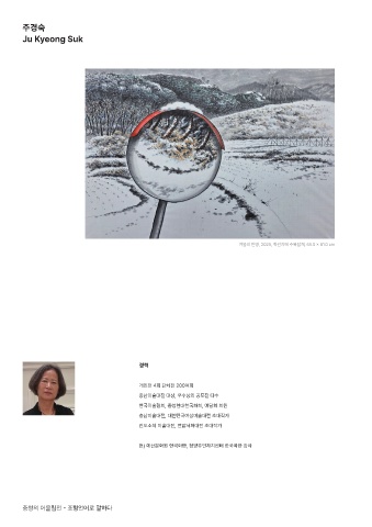 주경숙 Ju Kyeong Suk 겨울의 반영, 2025, 화선지에 수묵담채, 65.0 x 91.0 cm 경력 개인전 4회 단체전 200여회 충남미술대전 대상, 우수상외 공모전 다수 한국미술협회, 충청현대한국화회, 예담회 회원 충남미술대전, 대한민국여성미술대전 초대작가 진도소치 미술대전, 면암서화대전 초대작가 현) 예산문화원 한국화반, 청양주민자치센터 한국화반 강사 충청의 어울림전 - 조형언어로 말하다
