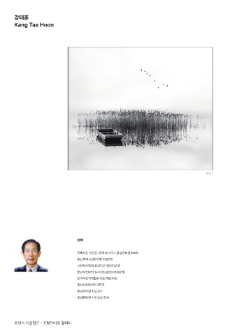 강태훈 Kang Tae Hoon 관조 2 경력 흑백사진 개인전<관조의 시각>,홍성문화원,1995 충남흑백사진연구회 회장(역) 사진작가협회 홍성지부 창립지부장 충남사진대전 심사위원,운영위원장(역) 한국사진작가협회 회원,자문위원 충남사진대전초대작가 홍성사우회 지도교수 홍성문화원 사진교실 강사 충청의 어울림전 - 조형언어로 말하다