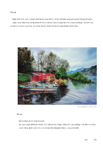 붉은 지붕의 건물과 정박해 있는 작은 배, 그리고 뒤편에 우거진 나무들이 조화를 이루고 있는 포근함을 느끼게 표현하고자 하였다.