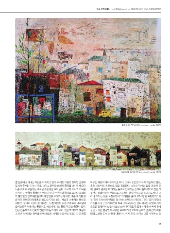 가 끊임없이 강조해온절대미의 양상을 보여주는가 하면, 때론 우리를 몽 러나 작가는 집을 표현하면서 “그리움을 풀어내고소망을 표현한다.” 사