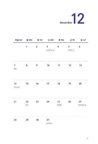 12 December 주일 SUN 월 MON 화 TUE 수 WED 목 THU 금 FRI 토 SAT 1 2 3 4 5 6 소비자의 날 무역의 날 7 8 9 10 11 12 13 대설 14 15 16 17 18 19 20 성서주일 21 22 23 24 25 26 27 동지 성탄절 원자력의 날 28 29 30 31 송구영신 3