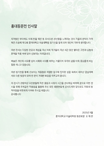워진 즈음에 제12회 홍익대학교 미술대학원 정기전을 열게 되어 대단히 기쁘게 생각합니다.