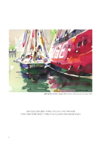 정박지, 항구(On the Berth, Seaport, NYC) 32x41cm Watercolor on cotton paper 2004 정박지 풍경은 멈춤과 출발이 교차하는 시간의 장소다. 작가는 배와 부두를 기다림과 이동의 정서를 은유한다. 이 작품은 도시 속 인간 존재의 근원적 유랑성을 담아낸다. 14