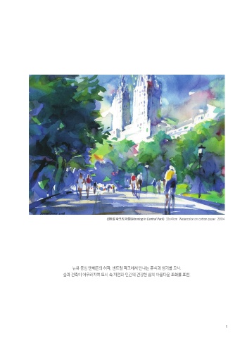 센트럴 파크의 아침(Morning in Central Park) 32x41cm Watercolor on cotton paper 2004 뉴욕 중심 맨해튼의 허파, 센트럴 파크에서 만나는 휴식과 생기를 묘사. 숲과 건축이 어우러지며 도시 속 자연과 인간의 건강한 삶의 아름다운 조화를 표현. 5