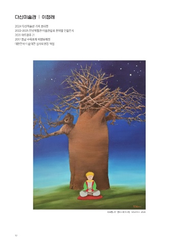 다산미술관 ㅣ 이정래 2024 다산미술관 기획 초대전 2022-2025 전남박물관·미술관협회 권역별 연합전시 2021 아트광주 21 2017 전남 수묵프레 비엔날레전 대한민국 미술대전 심사위원장 역임 바오밥나무 캔버스에 아크릴 130x97cm 2025 12