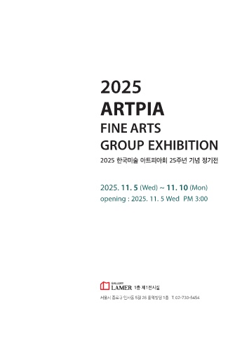 2025 ARTPIA FINE ARTS GROUP EXHIBITION 2025 한국미술 아트피아회 25주년 기념 정기전 2025. 11. 5 (Wed) ~ 11. 10 (Mon) opening : 2025. 11. 5 Wed PM 3:00 1층 제1전시실 서울시 종로구 인사동 5길 26 홍익빌딩 1층 T. 02-730-5454