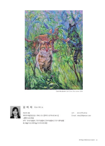 Cats in the Garden 53x72.7cm Oil on canvas 2024 김미자 Kim Mi Ja 개인전 2회 H P : 010-3775-8134 파리의 바람전(프랑스 히비스쿠스갤러리) 외 국내외 부스전 E-mail : miso238@naver.com 그룹전 64회 출품 현재 : 한국미술협회, 인천미술협회, 강화미술협회, 인천사생미술협 회, 예술만세, 한국미술 아트피아회 회원 한국미술 아트피아회 정기회원전 29