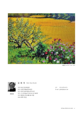 가을햇살 53x41cm Acrylic 2023 김희국 Kim Hee Kook 2020 대한민국 회화대전 H P : 010-5476-6123 2021 대한민국예술문화대상전 E-mail : golski@daum.net 2021 제9회 현대미술페스타 부스전 위원장 2021~23 한국미술 아트피아회 정기회원전 2023 제15회 한국수채화 페스티벌 2024 제1회 개인전 한국미술 아트피아회 정기회원전 37