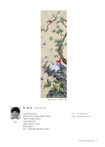 묘작도 140x45cm 한지에 채색 2025 박혜옥 Park Hea Ok 대한민국미술대전 입선 H P : 010-2008-2524 경기공예 디자인 민화대전 (2회입선, 1회특선) E-mail : artartok@naver.com 대한민국 민화대전 (3회입선) 이사 나혜석미술대전 특선 강릉단오서화대전 추천작가 단체전 회원전 다수 현재 : 수원미협 회원, 혜정민화연구소회원 한국미술 아트피아회 정기회원전 47
