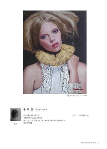 여인 41x31.8cm Oil on canvas 2020 송백일 Song Baek Il 백석예술대학교 회화전공 H P : 010-3769-1414 개인전 11회 / 그룹전 100여회 현재 : 한국미협 이사, 한국미술 아트피아 총무, 송파미술협회 드로 총무 잉 분과위원장 한국미술 아트피아회 정기회원전 53
