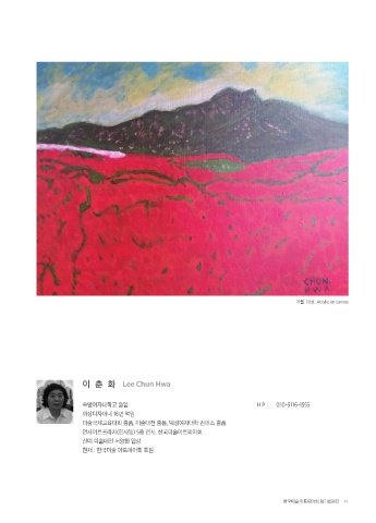 가을 10호 Acrylic on canvas 이춘화 Lee Chun Hwa 숙명여자대학교 졸업 H P : 010-5116-1555 의상디자이너 16년 역임 미술국제교육대회 출품, 미술대전 출품, 덕성여자대학 컴퍼스 출품 인사아트프라자(인사동) 5층 전시, 한국미술아트피아회 신미 미술대전 서양화 입상 현재 : 한국미술 아트피아회 회원 한국미술 아트피아회 정기회원전 71