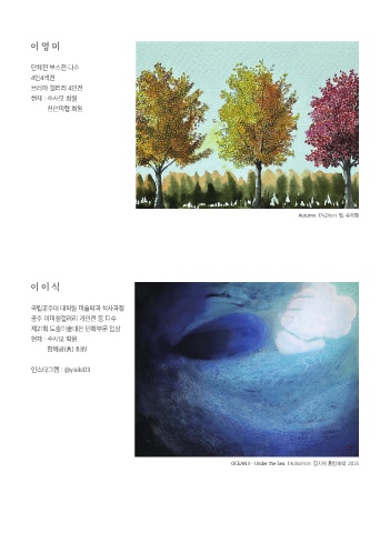 이 영 미 단체전 부스전 다수 4인4색전 브레아 갤러리 4인전 현재 : 수사모 회원 천안미협 회원 Autumn 17x24cm 펜, 수체화 이 이 식 국립공주대 대학원 미술학과 석사과정 공주 이미정갤러리 개인전 등 다수 제21회 도솔미술대전 민화부문 입상 현재 : 수사모 회원 함께공(共) 회원 인스타그램 : @yisiki03 OCEANⅡ- Under the Sea 116.8x91cm 장지에 혼합채색 2025