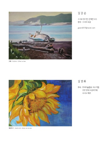 김 갑 순 수사모 정기전, 단체전 다수 현재 : 수사모 회원 gsoon0117@naver.com 흐름 72x53cm Oil on arches 김 경 화 현재 : 한국미술협회, 아산미협 천안 현대 여성작가회 수사모 회원 해바라기 53x45.5cm Acryic on canvas
