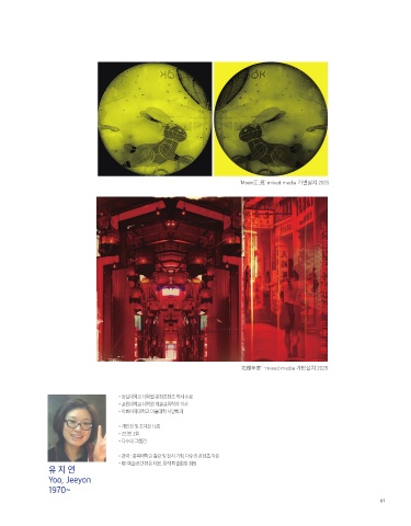 'Moon江_兎' mixed media 가변설치 2025 '花樣年華' -mixed media 가변설치 2025 •숭실대학교 대학원 문화콘텐츠 박사 수료 •교원대학교 대학원 미술교육학과 석사 •이화여자대학교 미술대학 서양화과 •개인전 및 초대전 16회 •2인전 2회 •다수의 그룹전 •경력 : 충북대학교 출강 및 전시 기획, 다수의 콘텐츠 자문 •現: 예술공간 뮤온 대표, 창작 미술협회 회원 유 지 연 Yoo, Jeeyon 1970~ 61