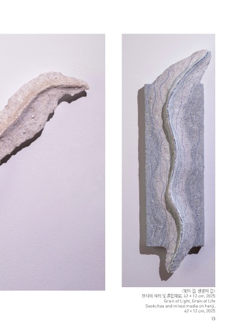 〈빛의 결, 생명의 결〉 한지에 석채 및 혼합재료, 42 × 12 cm, 2025 Grain of Light, Grain of Life Seokchae and mixed media on hanji, 42 × 12 cm, 2025 13