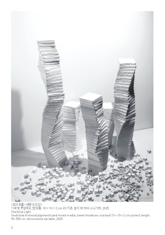 〈빛의 호흡—생명 빛의 탑〉 석채 및 혼합재료, 탑(모듈: 10 × 10 × 2 cm 판) 적층, 높이 90–500 cm(가변), 2025 Stacking Light Seokchae (mineral pigments) and mixed media, tower (modules: stacked 10 × 10 × 2 cm plates), height 90–500 cm, dimensions variable, 2025 2