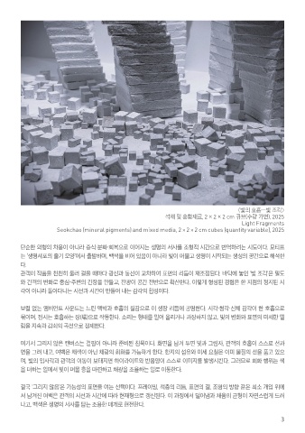 묶이며, 전시는 호흡하는 장(場)으로 작동한다. 소리는 형태를 밀어 올리거나 과장하지 않고, 빛의 변화와 표면의 미세한 떨