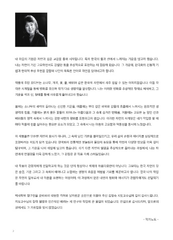 내 마음의 기원은 자연과 깊은 교감을 통해 시작됩니다. 특히 한국의 들과 산에서 느껴지는 기운을 담고자 했습니다.